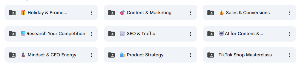 This is the full collection—every training, template, guide, worksheet, and strategy I've created for product-based business owners. SEO. Sales funnels. Content planning. Email sequences. Holiday marketing. Product sourcing. All of it.